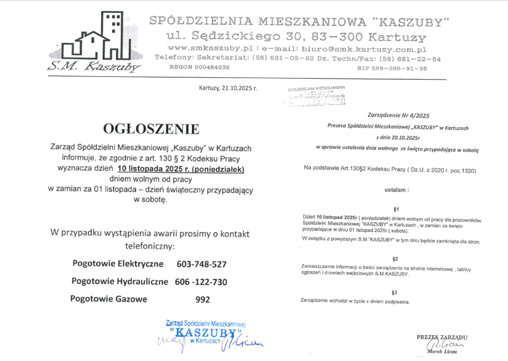 Biuro Spółdzielni w dn. 10.11. (poniedziałek) będzie zamknięte.