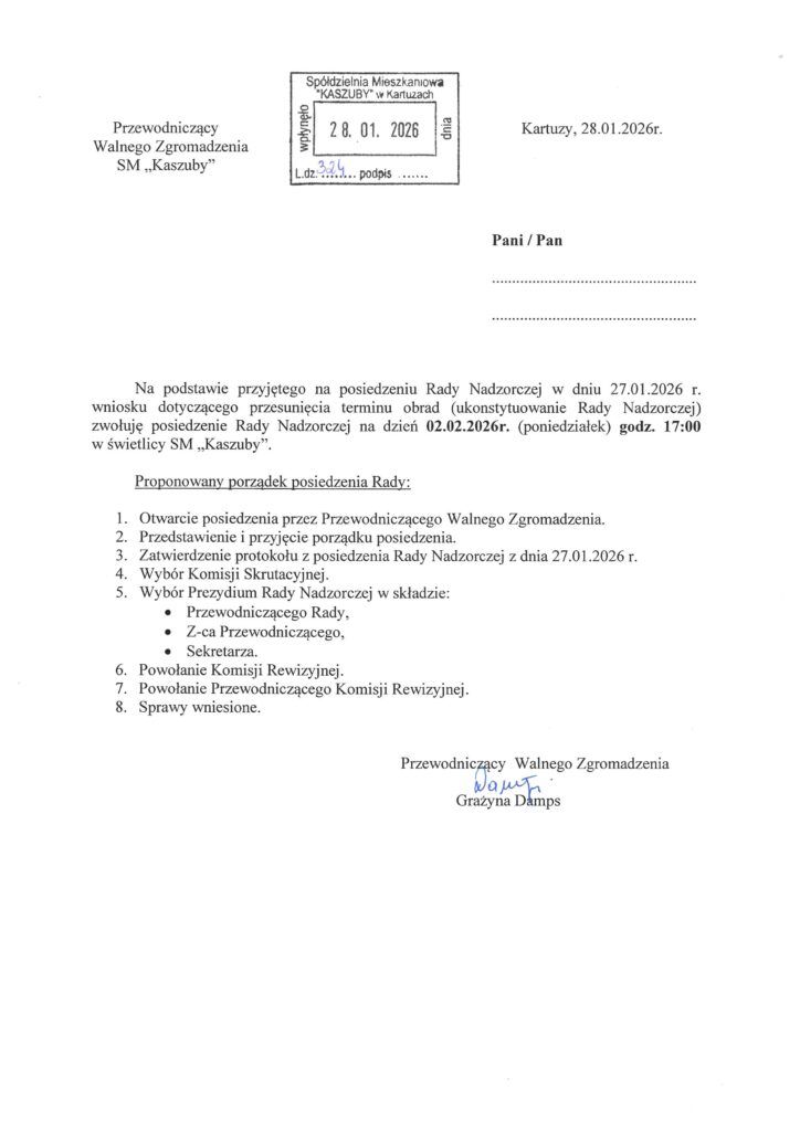 Informacja nt. Walnego Zgromadzenia Członków z dn. 20.01.2026r.26 stycznia, 2026Samoidentyfikacja nabywcy dla potrzeb KSeF2 lutego, 2026 28 stycznia, 2026 Udostępnij0 Powiązane posty23 marca, 2026Porządek posiedzenia Rady Nadzorczej na dzień 30.03.2026r. Czytaj więcej16 lutego, 2026Porządek posiedzenia Rady Nadzorczej na dzień 23.02.2026r. Czytaj więcej23 stycznia, 2026Porządek posiedzenia Rady Nadzorczej na dzień 27.01.2026r. Czytaj więcej
