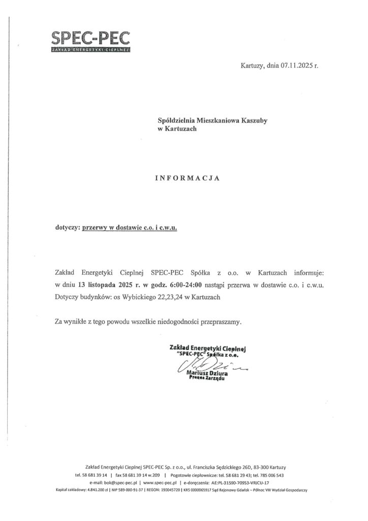 Przerwa w dostawie ciepłej wody użytkowej i centralnego ogrzewania na O/XX-Lecia.6 listopada, 2025Porządek posiedzenia Rady Nadzorczej na dzień 24.11.2025 r.17 listopada, 2025 7 listopada, 2025 Udostępnij0 Powiązane posty6 listopada, 2025Przerwa w dostawie ciepłej wody użytkowej i centralnego ogrzewania na O/XX-Lecia. Czytaj więcej4 listopada, 2025SM „Kaszuby” zatrudni pracownika Czytaj więcej27 października, 2025Biuro Spółdzielni w dn. 10.11. (poniedziałek) będzie zamknięte. Czytaj więcej