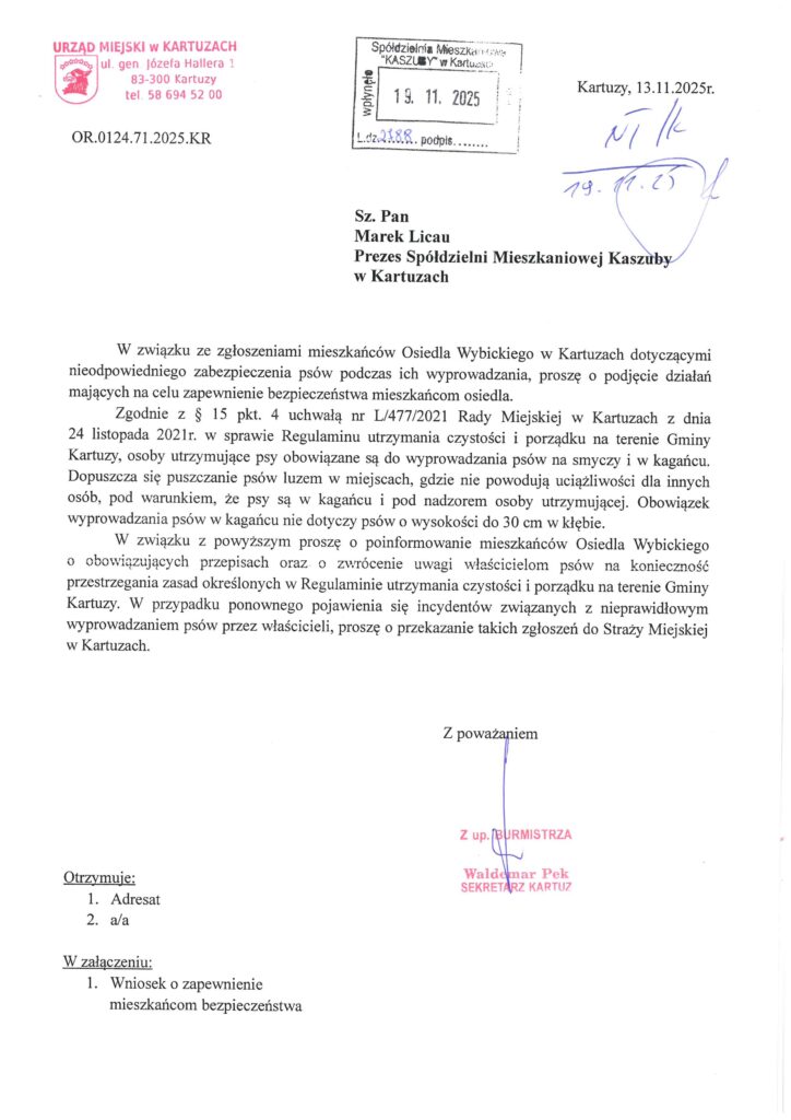 Ponadto, otrzymujemy liczne sygnały i skargi od Mieszkańców, którzy z niepokojem obserwują przypadki wyprowadzania psów bez smyczy i kagańca. Wielu osób odczuwa lęk przed psami chodzącymi „samopas” po osiedlu, a ich brak kontroli stanowi również zagrożenie dla spokoju i porządku publicznego. Takie zachowania stanowią naruszenie nie tylko naszego Regulaminu używania lokali i porządku domowego, ale również Regulaminu utrzymania czystości i porządku na terenie Gminy Kartuzy, w myśl których osoby posiadające zwierzęta domowe mają obowiązek sprawować nad nimi nadzór w miejscach publicznych i obowiązane są do wyprowadzania ich na smyczy.